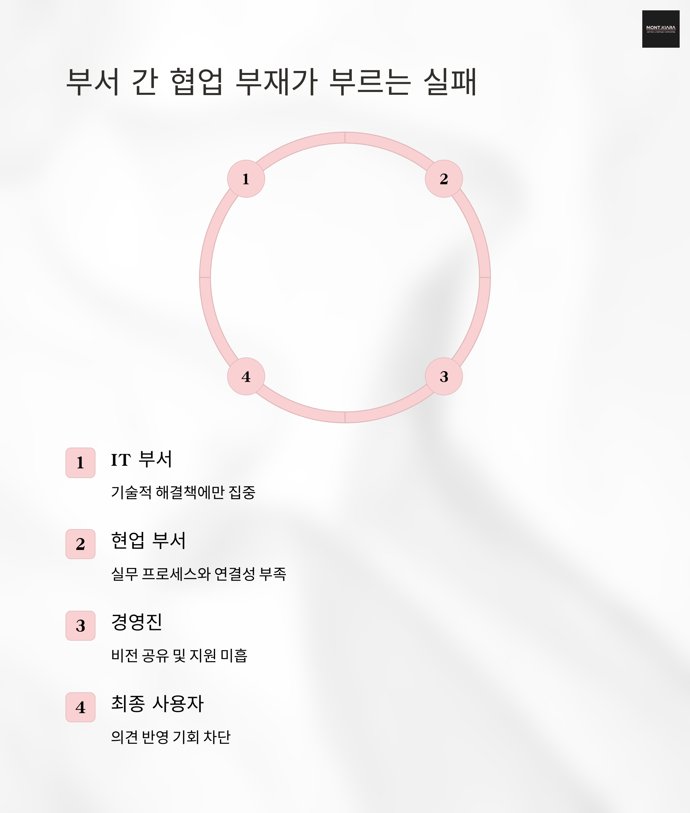 IT서비스가 실패하는 결정적 이유 중 하나는 부서 간의 사일로 운영입니다. IT팀은 기술 구현에 집중하고, 현업 부서는 일상업무에 바빠 의견 조율이 제대로 이루어지지 않습니다.